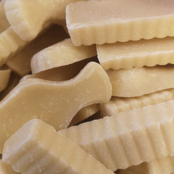White chocolate flavoured candy in the shape of fish and chips